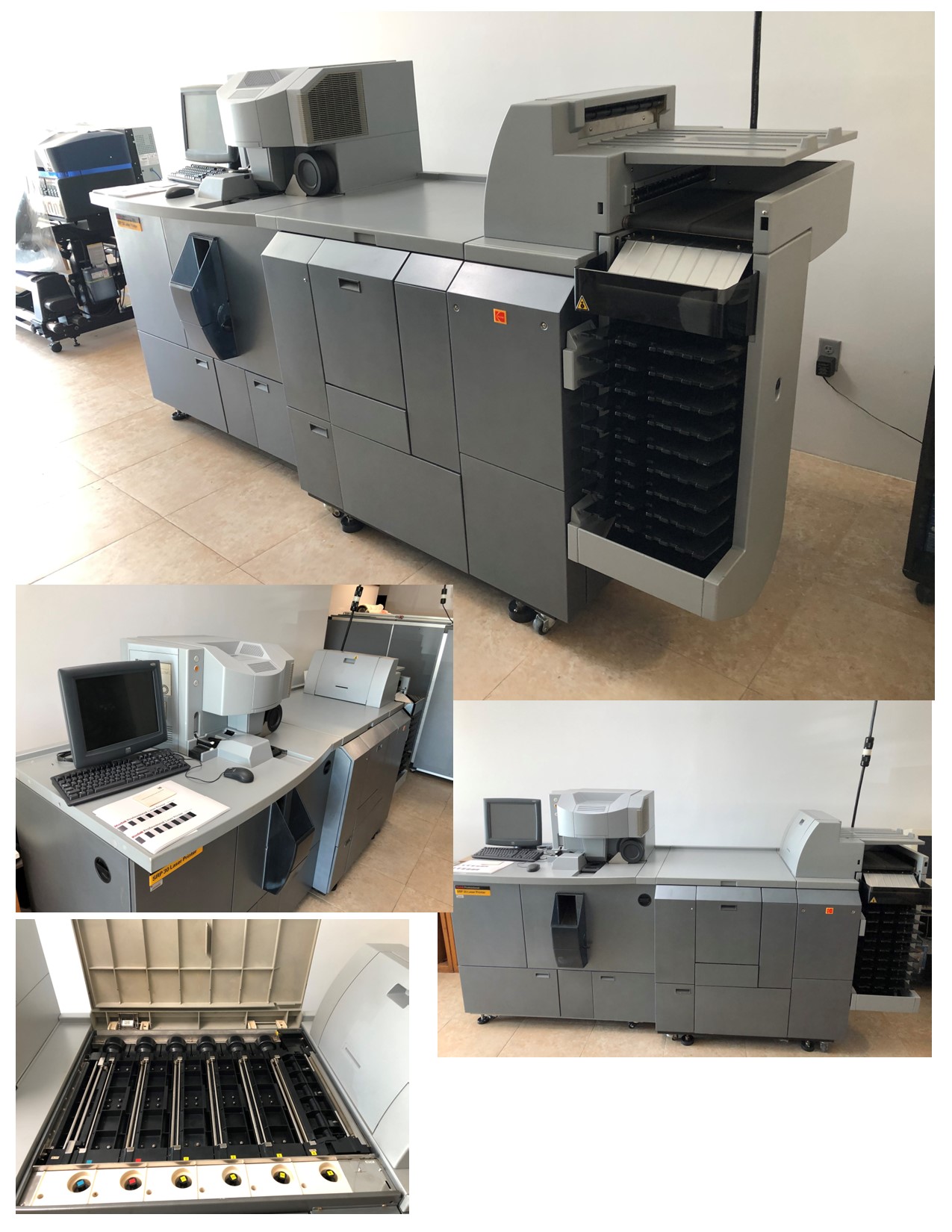 HP Indigo R1000 4 color offset press, installed but never used with paper jogger, Baum Autofolder 714 MP, Titan 200 20" paper cutter, 4 section metal dolly for print jobs, 2006 model